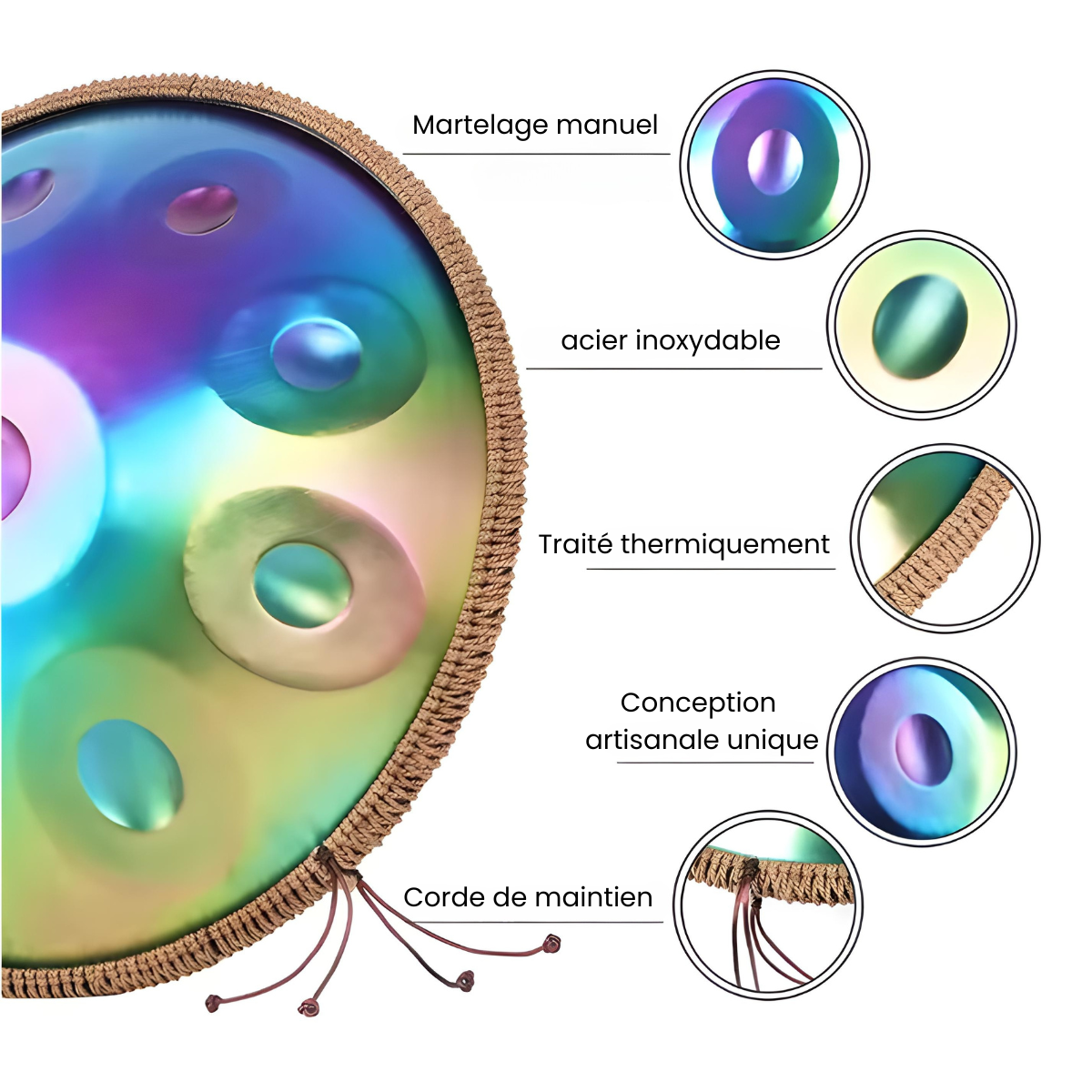 Chaque pièce est martelée et accordée à la main par des artisans spécialisés. Ce savoir-faire traditionnel donne naissance à un handpan à la résonance équilibrée, aux fréquences puissantes, et aux harmoniques enveloppantes.