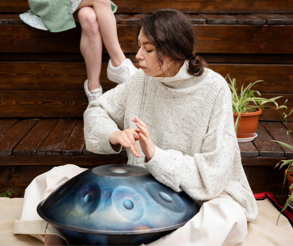 Jouer du Handpan favorise un état méditatif naturel, en mouvement. Il crée un lien entre le corps et l’esprit, permettant un ancrage émotionnel fort et une présence à soi accrue.